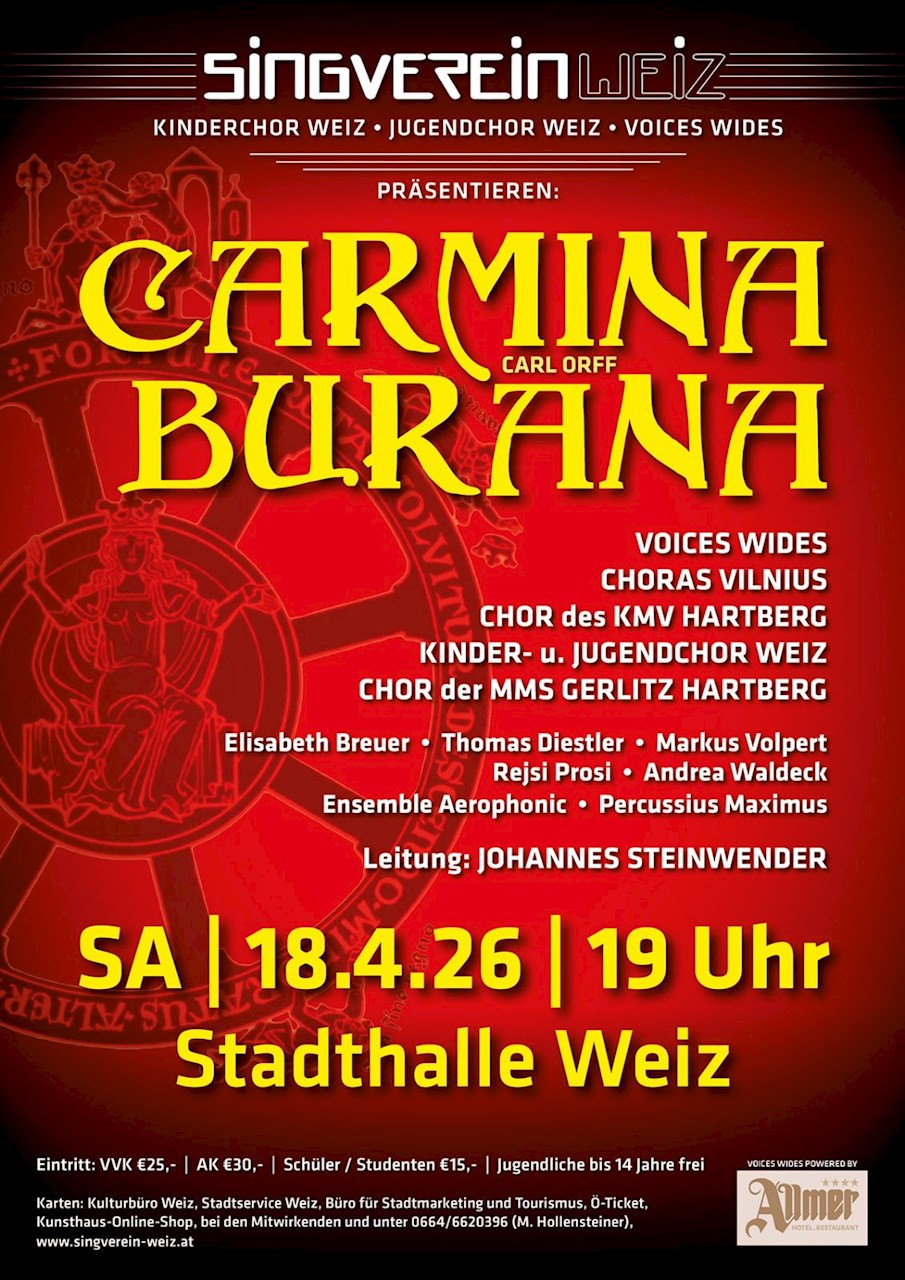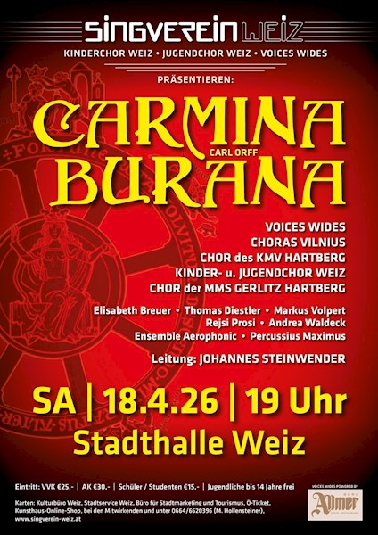 Gemeinsam mit dem Staatschor Vilnius, dem Chor des KMV Hartberg, dem Chor der 2aM der MMS Gerlitz, den fantastischen Solisten Elisabeth Breuer (Sopran), Thomas Diestler (Countertenor), Markus Volpert (Bariton), den Pianistinnen Rejsi Prosi und Andrea Waldeck, dem Ensemble Aerophonic und Percussius Maximus werden alle Chöre vom Singverein Weiz unter meiner Leitung die Stadthalle Weiz zum Beben bringen.
